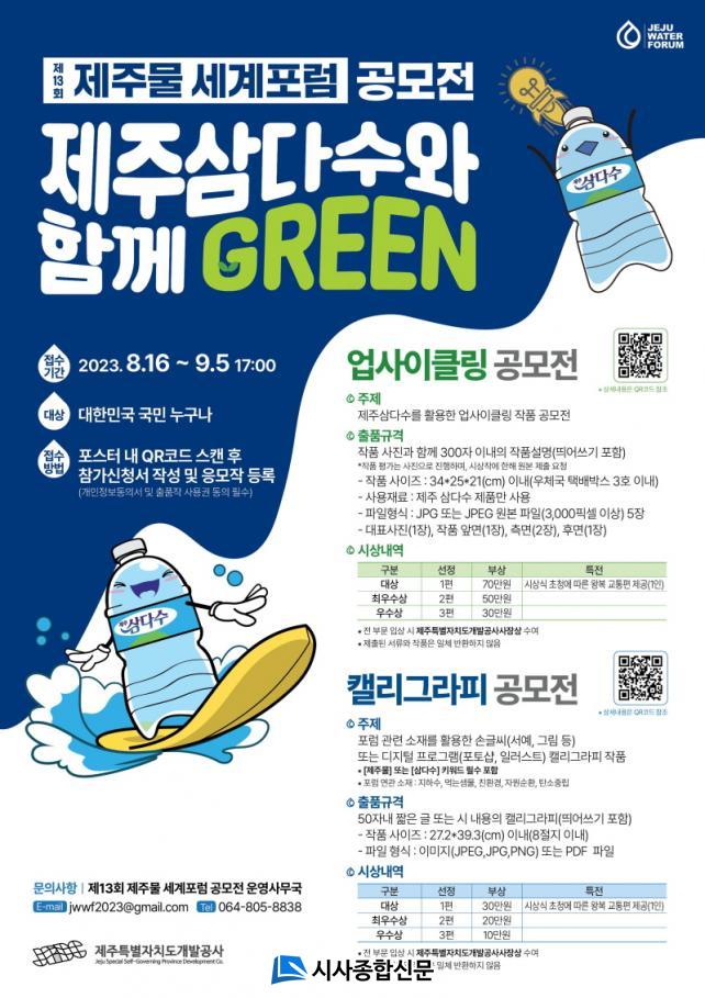 Á¦ÁÖ°³¹ß°ø»ç´Â ¿À´Â 9¿ù ¿¸®´Â ¡®Á¦13ȸ Á¦ÁÖ¹° ¼¼°èÆ÷·³¡¯À» ¾ÕµÎ°í ¹°ÀÇ ¼ÒÁßÇÔ°ú ÀÚ¿ø¼øÈ¯ÀÇ Á߿伺À» ¾Ë¸®°íÀÚ °í°´ Âü¿© °ø¸ðÀüÀ» ¸¶·ÃÇß´Ù. À̹ø °ø¸ðÀüÀº ¡®¾÷»çÀÌŬ¸µ ÀÛǰ¡¯°ú ¡®Ä¶¸®±×¶óÇÇ °ø¸ð¡¯ µÎ ºÐ¾ß·Î ÁøÇàµÇ¸ç, ¼ö»óÀÛÀº ¡®Á¦13ȸ Á¦ÁÖ¹° ¼¼°èÆ÷·³¡¯¿¡ Àü½ÃµÉ ¿¹Á¤ÀÌ´Ù.