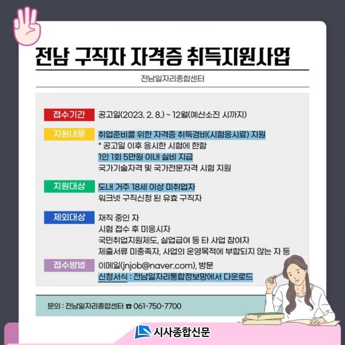 Ãë¾÷¿¡ ÇÊ¿äÇÑ ÀÚ°ÝÁõ Ãëµæºñ¸¦ Áö¿øÇÏ´Â »ç¾÷Àº Àü³²Áß¼Ò±â¾÷ÀÏÀÚ¸®°æÁ¦ÁøÈï¿ø¿¡¼ ½ÃÇàÇÏ´Â ¡®Àü³² ±¸Á÷ÀÚ ÀÚ°ÝÁõ ÃëµæÁö¿ø»ç¾÷¡¯ÀÌ´Ù. ÀÌ »ç¾÷Àº µµ³» °ÅÁÖ 18¼¼ ÀÌ»ó ¹ÌÃë¾÷ÀÚ°¡ Ãë¾÷ Áغñ¸¦ À§ÇÑ ÀÚ°ÝÁõ Ãëµæ ½Ã, 1ÀÎ 1ȸ ½ÃÇè ÀÀ½Ã·á ÃÖ´ë 5¸¸ ¿øÀ» Áö±ÞÇÑ´Ù. ±¹°¡±â¼úÀÚ°Ý ¹× ±¹°¡Àü¹®ÀÚ°Ý ½ÃÇè ÀÀ½Ã ½Ã °¡´ÉÇϸç Áö¿ø¹Þ°íÀÚ Çϴ û³âÀº Àü³²ÀÏÀÚ¸®Á¾ÇÕ¼¾ÅÍ(061-750-7700)·Î ½ÅûÇÏ¸é µÈ´Ù.