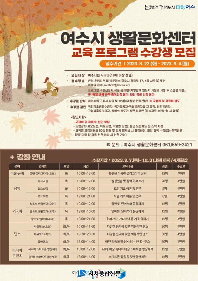 19¼¼ ÀÌ»ó ¿©¼ö½Ã¹Î ´©±¸³ª Âü¿©ÇÒ ¼ö ÀÖÀ¸¸ç, ¿À´Â 9¿ù 4ÀϱîÁö ¼ö°Èñ¸ÁÀÚ º»ÀÎÀÌ ¿©¼ö½Ã »ýȰ¹®È¼¾ÅÍ ´ã´çÀÚ ½Åû¼¸¦ Á¦ÃâÇÏ¸é µÈ´Ù. À̶§ µ¿ÀÏ ºÐ¾ß Áߺ¹½Åû Àº ºÒ°¡ÇÏ´Ù. ±âŸ ÀÚ¼¼ÇÑ »çÇ×Àº ¿©¼ö½Ã »ýȰ¹®È¼¾ÅÍ(¢Ï061-659-2421)¿¡ ¹®ÀÇÇÏ¸é µÈ´Ù.