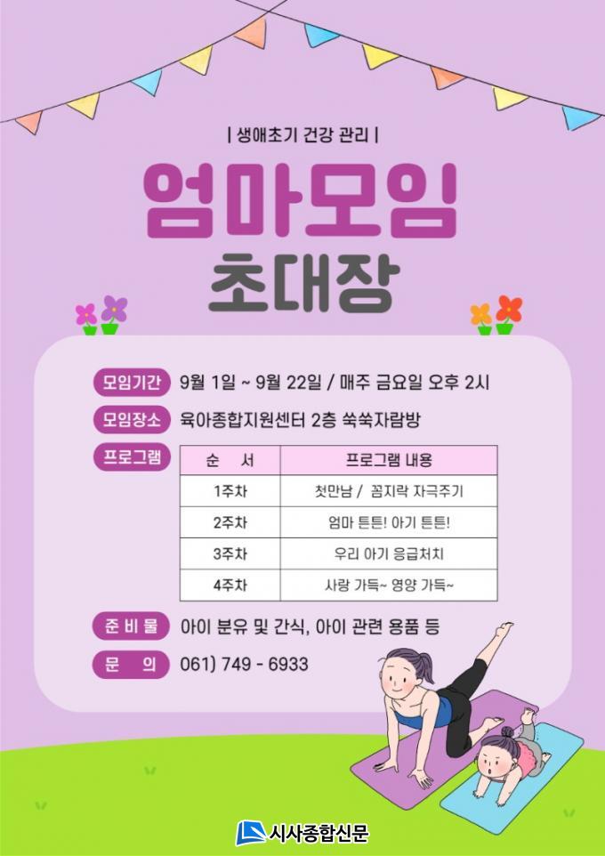 ¸ðÀÓÀº ¼øÃµ½Ã À°¾ÆÁ¾ÇÕÁö¿ø¼¾ÅÍ¿¡¼ ÁÖ 1ȸ(±Ý¿äÀÏ) 4ȸ±â µ¿¾È ¿î¿µµÇ¸ç, ÇÁ·Î±×·¥Àº ¡ã1ÀÏ ¼·Î ¾Ë¾Æ°¡±â, ¾Æ±âÀå³°¨ ¸¸µé±â ¡ã8ÀÏ º£À̺ñ ¸¶»çÁö&»êÈĿ䰡 ¡ã15ÀÏ ¾Æ±â ¾ÈÀü ±³À° ¡ã22ÀÏ À¯¾Æ½Ä ¿µ¾ç±³À°ÀÇ ³»¿ëÀ¸·Î ±¸¼ºµÈ´Ù.