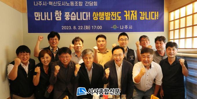 ³ªÁÖ½Ã(½ÃÀå À±º´ÅÂ)´Â ÃÖ±Ù À±º´Å ½ÃÀå°ú Çõ½Åµµ½Ã³ëÁ¶¿Í ¼ÒÅë °£´ãȸ¸¦ °¡Á³´Ù°í 28ÀÏ ¹àÇû´Ù. Çõ½Åµµ½Ã³ëÁ¶´Â Çѱ¹Àü·Â°ø»ç, ÇÑÀüKDN, ÇÑÀüKPS, ÇÑÀüFMS, ÇÑÀüCSC µî 5°³ Àü·Â ±â°ü ³ëµ¿ÀÚ¸¦ À§ÇÑ ´Üü´Ù. À̳¯ °£´ãȸ¿¡´Â 5°³»ç ³ëÁ¶ ÀÓ¿øÁø 12¸íÀÌ Âü¼®ÇÑ °¡¿îµ¥ ºû°¡¶÷µ¿ ¸ð ½Ä´ç¿¡¼ ÁøÇàµÆ´Ù.