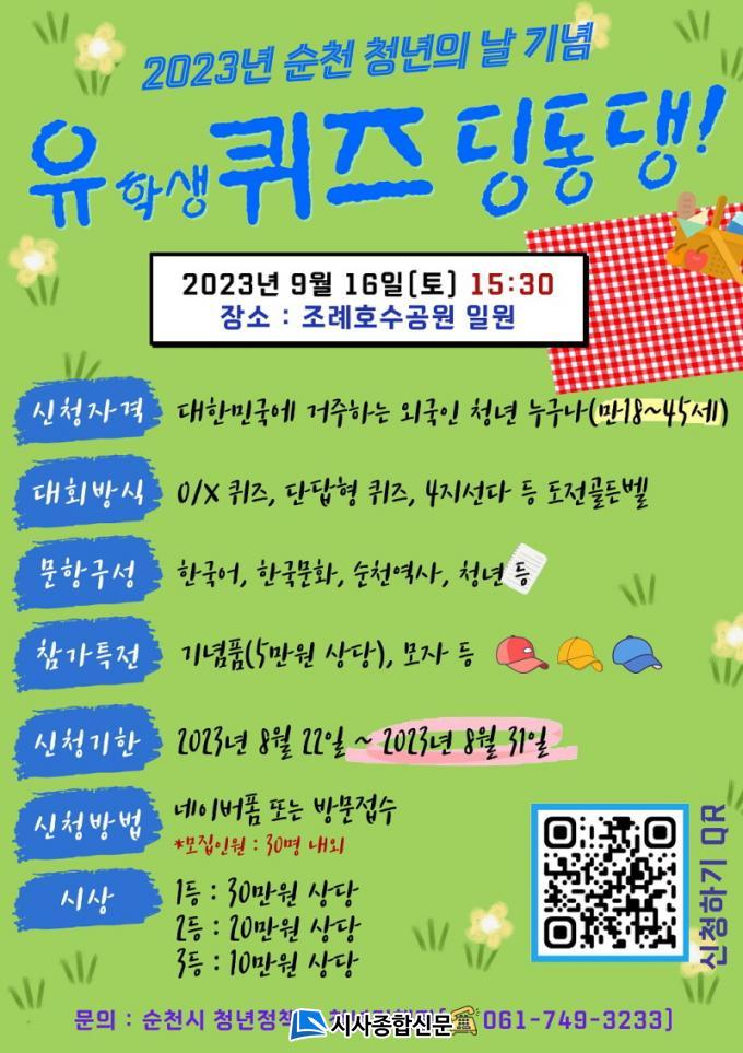 2023³â 7¿ù ±âÁØ ¼øÃµ½Ã¿¡ °ÅÁÖ ÁßÀÎ ¿Ü±¹ÀÎÀº 2,719¸íÀ¸·Î, ±×Áß 18¼¼~45¼¼ ¿Ü±¹ÀÎÀº 2,048¸íÀ̸ç, À̹ø ÄûÁî´ëȸ´Â À¯Çлý û³â»Ó¸¸ ¾Æ´Ï¶ó ÀÏ¹Ý ¿Ü±¹ÀΠû³âµéÀÌ Âü¿©ÇØ Çѱ¹°ú ¼øÃµ¿¡ ´ëÇØ ÀÌÇØÇÏ°í °ø°¨´ë¸¦ Çü¼ºÇÏ´Â ¹®È ±³·ùÀÇ ÀåÀ» ¸¸µé±â À§ÇØ ±âȹµÆ´Ù.