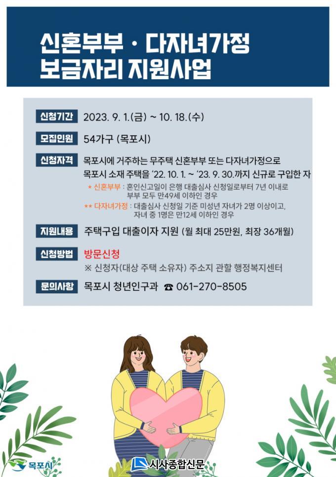 | ¸ñÆ÷½Ã, ¡¸½ÅÈ¥ºÎºÎ ․ ´ÙÀڳడÁ¤ º¸±ÝÀÚ¸® Áö¿ø»ç¾÷¡¹´ë»óÀÚ ¸ðÁý 9¿ù 1ÀÏ ~ 10¿ù 18ÀϱîÁö 54°¡±¸ ¸ðÁý