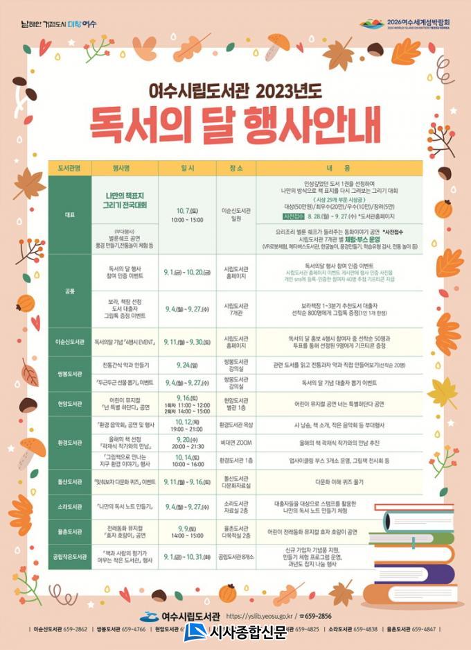 ¿©¼ö½Ã´Â 9¿ù µ¶¼ÀÇ ´Þ¿¡ µµ¼°ü ¹æ¹® ¹× µ¶¼ ÁõÁøÀ» À§ÇÑ ´Ù¾çÇÑ ¹®ÈÇà»ç¸¦ °³ÃÖÇØ ±àÁ¤ÀûÀÎ µ¶¼È°µ¿ üÇè°ú µµ¼°ü ÀÌ¿ë Áõ´ë¿¡ ±â¿©ÇÑ´Ù´Â ¹æÄ§ÀÌ´Ù. ¿î¿µÀå¼Ò´Â ½Ã¸³ µµ¼°ü 7°³°üÀ¸·Î ´©±¸³ª Âü¿©ÇÒ ¼ö ÀÖÀ¸¸ç À¯¾ÆºÎÅÍ Çлý, ¼ºÀαîÁö Àü ¿¬·ÉÀÌ Âü¿©ÇÒ ¼ö ÀÖ´Â Çà»ç°¡ ¸¶·ÃµÈ´Ù.