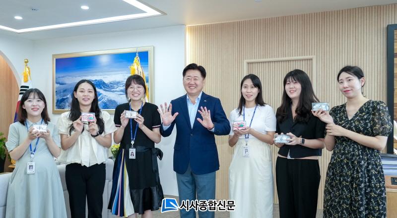 À̳¯ ÀӽаøÁ÷Àڵ鿡°Ô´Â ÅÂ¾Æ¿Í Àӽźθ¦ º¸È£Çϱâ À§ÇÑ ÀüÀÚÆÄ Â÷´Ü ´ã¿ä¿Í Ãâ»êÀ» ÃàÇÏÇÏ´Â ¾Æ±â ¹è³ÁÀú°í¸®¿Í ½Å¹ßÀÌ Àü´ÞµÆ´Ù. ÀÌ¾î¼ ¿À¿µÈÆ Áö»ç´Â µµÃ» °øÁ÷ÀÚµé°ú ÇÔ²² µµÃ» ·Îºñ¿¡¼ ÁøÇàµÈ ¹®ÈÇà»çÀÎ ¡®³î¸é ÄܼƮ¡¯¿¡ Âü¿©Çß´Ù.