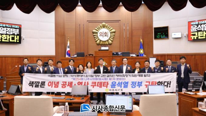 ³ªÁÖ½ÃÀÇȸ´Â °áÀǾÈÀ» ÅëÇØ ¡°À±¼®¿ Á¤ºÎ°¡ ³¯À» ¼¼¿î ÀÌ³ä °ø¼¼¸¦ ¾Õ¼¼¿ö ¿ª»ç µÚÁý±â, ¿ª»ç Äíµ¥Å¸¸¦ ÀÚÇàÇÏ¸ç ±¹·ÐÀ» ºÐ¿½Ã۰í ÀÖ´Ù¡±¶ó¸ç ¡°°ø»êÀüüÁÖÀÇ¡¯¶ó´Â ½ÅÁ¶¾î±îÁö ¸¸µé¾î³»¸ç ¡®À̳äÀüÀ¿¡ ¸ôµÎÇϰí ÀÖ´Â À±¼®¿ Á¤ºÎÀÇ ¹Ý¿ª»çÀû ÇàŰ¡ ÂüÀ¸·Î Åëź½º·´´Ù.¡±¶ó°í °ÇÏ°Ô ºñÆÇÇß´Ù.