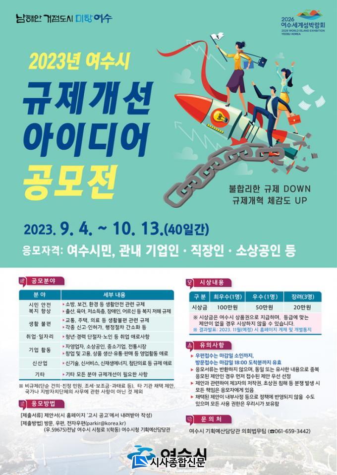 ½ÅûÀº ¿©¼ö½Ã ȨÆäÀÌÁö(www.yeosu.go.kr) ¡®°í½Ã°ø°í¡¯¿¡ °Ô½ÃµÈ Á¦¾È¼¸¦ ÀÛ¼ºÇØ ¹æ¹®, ¿ìÆí(59675 ¿©¼ö½Ã ½Ãû·Î 1, ¿©¼ö½Ãû ±âȹ¿¹»ê´ã´ç°ü), À̸ÞÀÏ(parkir@korea.kr) Áß Çϳª·Î ÇÏ¸é µÈ´Ù.