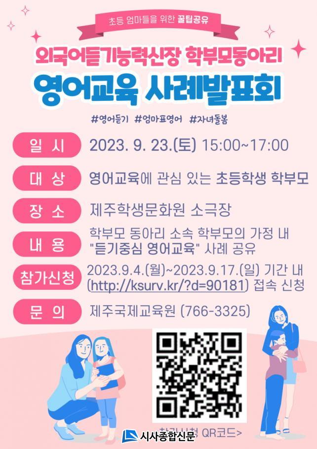[½Ã»çÁ¾ÇսŹ® = °í¼º¹Î ±âÀÚ] Á¦ÁÖ±¹Á¦±³À°¿ø(¿øÀå °½Â¹Î)Àº ÀÚ³àµéÀÇ ¿µ¾î±³À°¿¡ °ü½É ÀÖ´Â ÃʵîÇб³ Çкθ𸦠´ë»óÀ¸·Î 9¿ù 23ÀÏ(Åä)¿¡ ¿Ü±¹¾îµè±â´É·Â½ÅÀå Çкθ𠵿¾Æ¸® »ç·Ê¹ßǥȸ¸¦ ½Ç½ÃÇÑ´Ù.