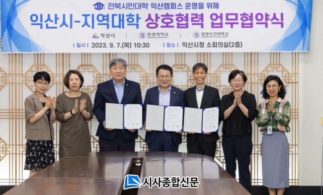 ÀÍ»ê½Ã´Â 7ÀÏ ½Ãû ¼ÒȸÀǽǿ¡¼ Áö¿ª 2°³ ´ëÇб³¿Í ¡®ÀüºÏ½Ã¹Î´ëÇÐ ÀÍ»êÄ·ÆÛ½º¡¯¿î¿µÀ» À§ÇÑ ÄÁ¼Ò½Ã¾ö ¾÷¹«Çù¾àÀ» ü°áÇß´Ù. À̳¯ ¾÷¹«Çù¾à¿¡ Á¤ÇåÀ² ÀÍ»ê½ÃÀå°ú ¿ø±¤´ëÇб³ ¹Ú¼ºÅ ÃÑÀå, ¿ø±¤º¸°Ç´ëÇб³ ¹éÁØÈì ÃÑÀåÀÌ Âü¼®ÇÏ¿© ¶æÀ» ÇÔ²²Çß´Ù.