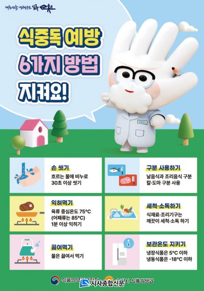 ¼øÃµ½Ã º¸°Ç¼Ò´Â ½ÄÁßµ¶ ¿¹¹æÀ» À§Çؼ´Â ¡âÁ¶¸® ½Ã È帣´Â ¹°¿¡ 30ÃÊ ÀÌ»ó ¼Õ ¾Ä±â ¡â¹°Àº ²ú¿© ¸¶½Ã±â ¡â½ÄÀç·á, Á¶¸®±â±¸´Â ±ú²ýÀÌ ¼¼Ã´ ¶Ç´Â ¼Òµ¶ ÈÄ º¸°üÇϱ⠡âÄ®°ú µµ¸¶´Â À°·ù¿ë¡¤¾î·ù¿ë¡¤Ã¤¼Ò¿ëÀ¸·Î ±¸ºÐÇØ »ç¿ëÇϱ⠡â³ÃÀå ½ÄǰÀº 5¡É ÀÌÇÏ¿¡¼, ³Ãµ¿½ÄǰÀº –18¡É ÀÌÇÏ¿¡¼ º¸°üÇϱ⠡âÀ°·ùÁ¶¸® ½Ã Á߽ɿµµ 75¡É(¾îÆÐ·ù´Â 85¡É) À̻󿡼 1ºÐ ÀÌ»ó ÀÍÇô ¸Ô±â µî 6´ë ¼öÄ¢À» ¹Ýµå½Ã ÁؼöÇØ¾ß ÇÑ´Ù°í °Á¶Çß´Ù.