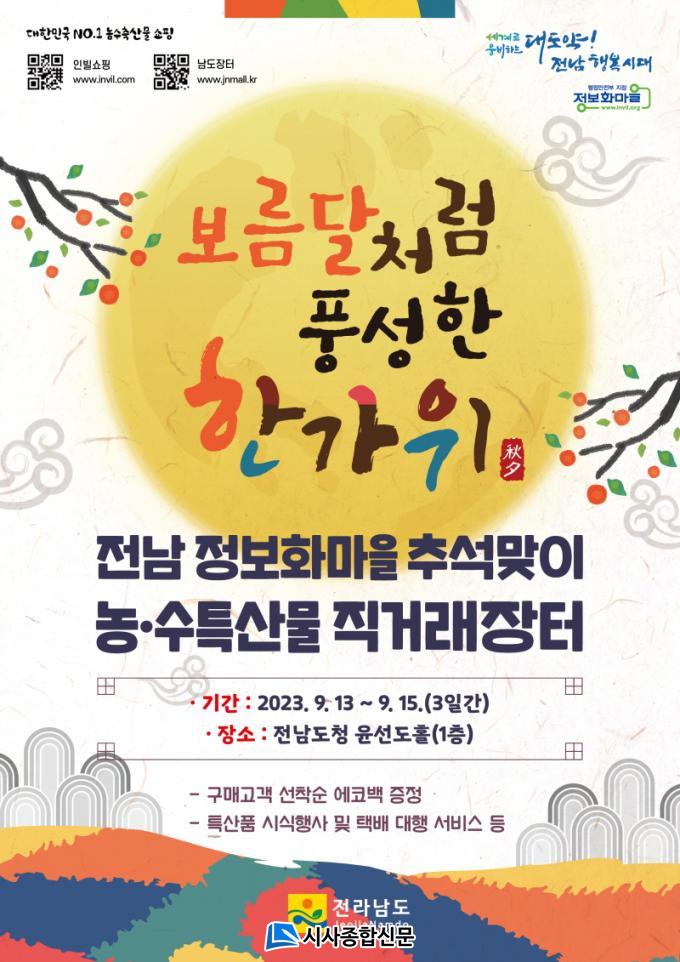 [½Ã»çÁ¾ÇսŹ® = ¿À½ÂÅà ±âÀÚ] Àü¶ó³²µµ´Â Ãß¼® ´ë¸ñÀ» ¸Â¾Æ ¿À´Â 13ÀϺÎÅÍ 3Àϰ£ µµÃ» À±¼±µµÈ¦(1Ãþ ·Îºñ)¿¡¼ Á¤º¸È¸¶À» »ý»ê ¿ì¼ö ³ó¼ö»ê¹°À» ÆÇ¸ÅÇÏ´Â 2023³â Ãß¼®¸ÂÀÌ Á¤º¸È¸¶À» Á÷°Å·¡ÀåÅ͸¦ ¿¬´Ù°í ¹àÇû´Ù.