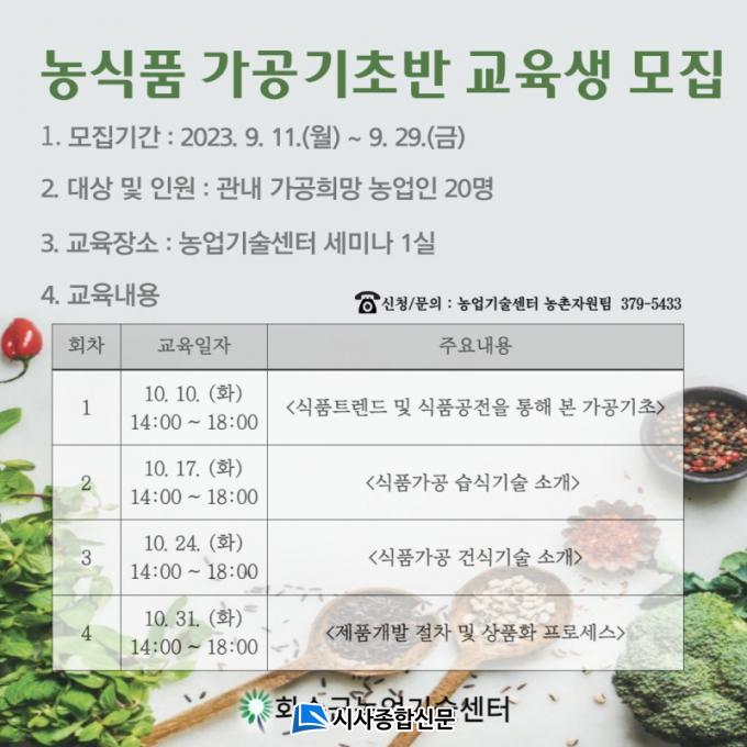 | ȼø±º, ³ó»ê¹° °¡°ø ±âÃÊ¹Ý ±³À°»ý ¸ðÁý ±³À° ½ÅûÀº 9¿ù 11ÀϺÎÅÍ 29ÀϱîÁö ¼±Âø¼ø 20¸í |