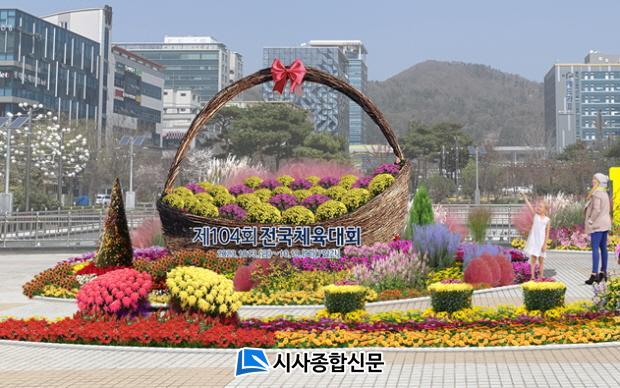 ÀÌ ´ëÇü ²ÉžÀº ±æÀÌ 6m, ³ôÀÌ 4mÀÇ ±¸Á¶¹°·Î Á¦104ȸ Àü±¹Ã¼À°´ëȸ ¹®±¸°¡ Àü¸é¿¡ »õ°ÜÁ® ÀÖ°í, ±¹È¿Í ÃÊÈ·ù 570º»À¸·Î ¾Æ¸§´ä°Ô ²Ù¸çÁ® ÀÖÀ¸¸ç Àü±¹Ã¼Àü È«º¸ ±Ø´ëÈ ¹× ¼º°øÀûÀÎ °³ÃÖ¸¦ ±â¿øÇϱâ À§ÇØ Àü³²µµÃ»°ú °¡±î¿î ³²¾ÇÁß¾Ó°ø¿ø¿¡ ¼³Ä¡µÆ´Ù.