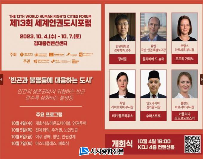 ±¤ÁÖ±¤¿ª½Ã(½ÃÀå °±âÁ¤)´Â À¯¿£ ÀαÇÃÖ°í´ëÇ¥»ç¹«¼Ò, À¯³×½ºÄÚ, ±¹°¡ÀαÇÀ§¿øÈ¸, ±¤Áֽñ³À°Ã»°ú °øµ¿À¸·Î ¿À´Â 10¿ù 4ÀϺÎÅÍ 7ÀϱîÁö ±è´ëÁßÄÁº¥¼Ç¼¾ÅÍ¿¡¼ ¡®Á¦13ȸ ¼¼°è Àαǵµ½ÃÆ÷·³¡¯(ÀÌÇÏ ±¤ÁÖÆ÷·³)À» °³ÃÖÇÑ´Ù. ¿ÃÇØ ÁÖÁ¦´Â ¡®ºó°ï°ú ºÒÆòµî¿¡ ´ëÀÀÇÏ´Â µµ½Ã(Human Rights Cities Responding To Poverty And Inequalities)¡¯ÀÌ´Ù.