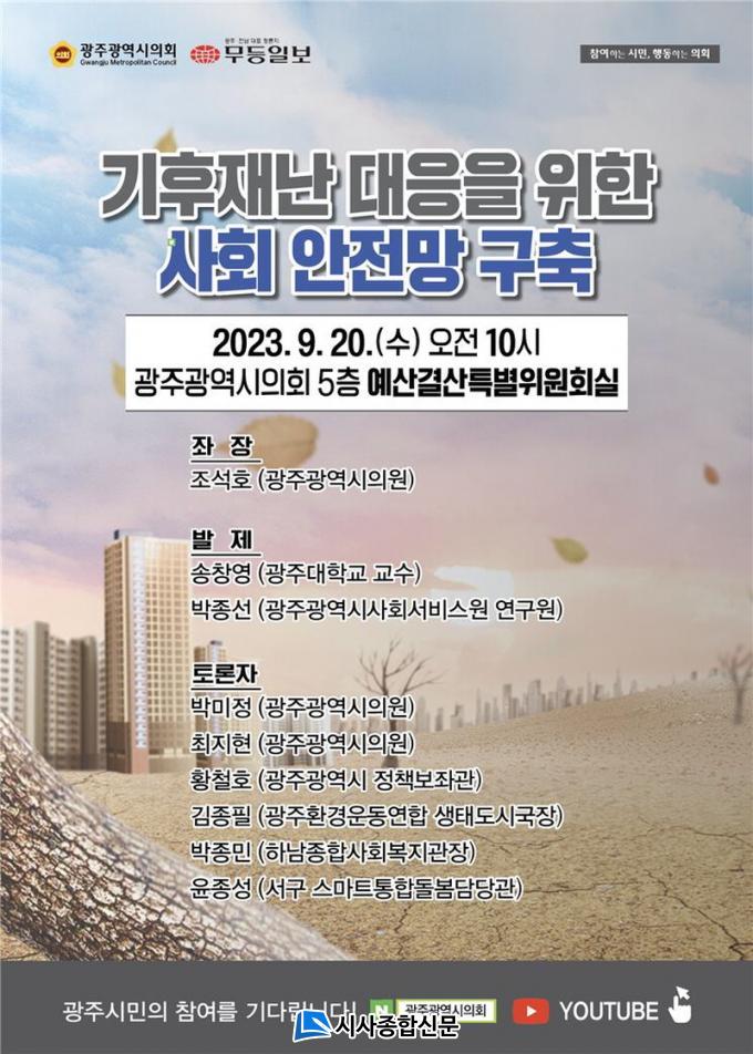 ±¤ÁÖ½ÃÀÇȸ¿Í ¹«µîÀϺ¸´Â 20ÀÏ ¿ÀÀü 10½Ã ½ÃÀÇȸ 5Ãþ ¿¹»ê°á»êƯº°À§¿øÈ¸½Ç¿¡¼ ¡®±âÈÄÀç³ ´ëÀÀÀ» À§ÇÑ »çȸ ¾ÈÀü¸Á ±¸Ã࡯ Á¤Ã¥Åä·Ðȸ¸¦ °³ÃÖÇÑ´Ù°í 19ÀÏ ¹àÇû´Ù.
