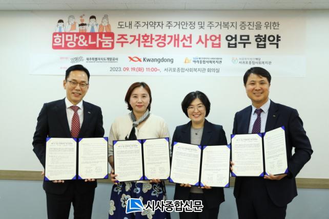 Á¦ÁÖ»ï´Ù¼ö¸¦ »ý»ê¡¤ÆÇ¸ÅÇÏ´Â Á¦ÁÖ°³¹ß°ø»ç(»çÀå ¹é°æÈÆ)¿Í À¯Åë»ç ±¤µ¿Á¦¾à(´ëÇ¥ÀÌ»ç ÃÖ¼º¿ø)Àº ¾Æ¶óÁ¾ÇÕ»çȸº¹Áö°ü(°üÀå ±Ç¹Ì¾Ö), ¼±ÍÆ÷Á¾ÇÕ»çȸº¹Áö°ü(°üÀå °ÈñÁ¤)°ú ÇÔ²² ¼±ÍÆ÷Á¾ÇÕ»çȸº¹Áö°ü¿¡¼ ¡®Èñ¸Á&³ª´® ÁÖ°Åȯ°æ°³¼±»ç¾÷¡¯ ¾÷¹«Çù¾àÀ» ü°áÇß´Ù. Á¦ÁÖ Áö¿ª ³» ¿¾ÇÇÑ È¯°æ¿¡ °ÅÁÖÇÏ´Â ÁְžàÀÚ¿¡°Ô ÄèÀûÇÏ°í ¾ÈÀüÇÑ º¸±ÝÀÚ¸®¸¦ Á¦°øÇÑ´Ù´Â ÃëÁö´Ù.