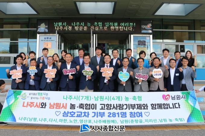 »çÁø¼³¸í : Àü³² ³ªÁֽà °ü³» 7°³ ³óÇù°ú ÀüºÏ ³²¿ø½Ã 4°³ ³ó¡¤ÃàÇùÀÌ °íÇâ»ç¶û »óÈ£ ±³Â÷ ±âºÎ¿¡ µ¿ÂüÇÏ°í ±â³ä»çÁøÀ» ÃÔ¿µÇϰí ÀÖ´Ù.