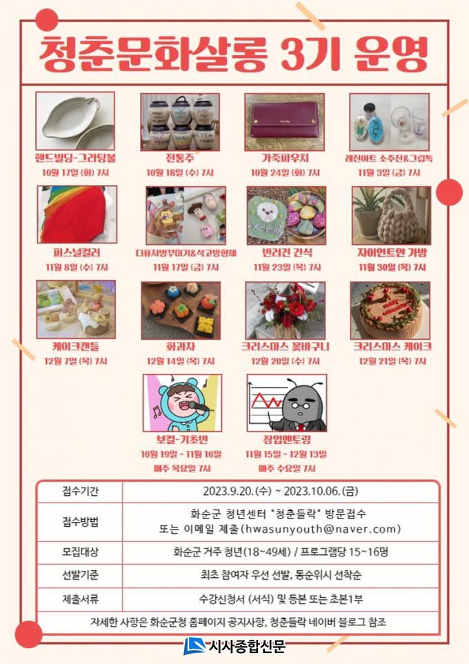 ¸ðÁý ´ë»óÀº 18¡49¼¼ ȼø±º °ÅÁÖ Ã»³âÀ¸·Î, ÇÁ·Î±×·¥´ç 15¡16¸íÀ» ¸ðÁýÇϸç, Âü¿©¸¦ Èñ¸ÁÇϴ û³âÀº ¼ö°½Åû¼ ¹× Áֹεî·Ïµîº» ¶Ç´Â Ãʺ» 1ºÎ¸¦ ȼø±º û³â¼¾ÅÍ ¡°Ã»Ãá µé¶ô¡± »ç¹«½Ç¿¡ ¹æ¹®¡¤Á¢¼öÇϰųª À̸ÞÀÏ(hwasunyouth@naver.com)·Î Á¦ÃâÇÑ´Ù.