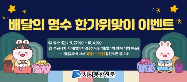 ¡®ÇѰ¡À§ ¸ÂÀÌ À̺¥Æ®¡¯´Â ¿À´Â 27ÀϺÎÅÍ 10¿ù 4ÀϱîÁö ÁøÇàµÇ¸ç, Çà»ç ±â°£ ¡¸¹è´ÞÀǸí¼ö¡¹¾ÛÀ» ÅëÇØ ÁÖ¹®ÇÑ °í°´À» ´ë»óÀ¸·Î 1ȸ ÁÖ¹® ½Ã ¹è¸íÀÇ ¸¶ºí À̶ó´Â ÁÖ»çÀ§ °ÔÀÓ Âü¿© ÀÀ¸ð±Ç 1ÀåÀ» Á¦°øÇÑ´Ù. °ÔÀÓ °á°ú¿¡ µû¶ó ÃÑ 850¸í¿¡°Ô 3õ¿øºÎÅÍ 1¸¸¿ø±îÁöÀÇ ÇÒÀÎÄíÆùÀ» Áö±ÞÇÑ´Ù. ÇÒÀÎÄíÆùÀº Áö±ÞÀϷκÎÅÍ 90ÀÏ À̳» »ç¿ëÇÒ ¼ö ÀÖ´Ù.
