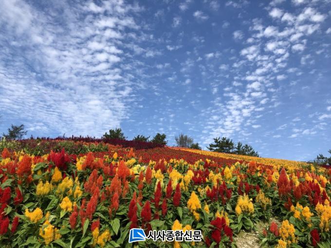 ÃàÁ¦°¡ ¿¸®´Â º´Ç³µµ ¸Çµå¶ó¹Ì°ø¿øÀº Àç¹è¸éÀû 14.1ha·Î Àü±¹ ÃÖ´ë ±Ô¸ðÀÇ 340¸¸ º» 1¾ï 4¹é¸¸ ¼ÛÀÌÀÇ ÇüÇü»ö»ö ¸Çµå¶ó¹Ì°¡ ¹Ý±â°í, Ȧ·Î ¼ÚÀº ±¸¸ªÁö·Î ¸¶À»°ú °¹¹úÀÌ ÇÑ´«¿¡ º¸À̴ ȯ»óÀûÀÎ °æÄ¡¸¦ ¼±»çÇÑ´Ù.