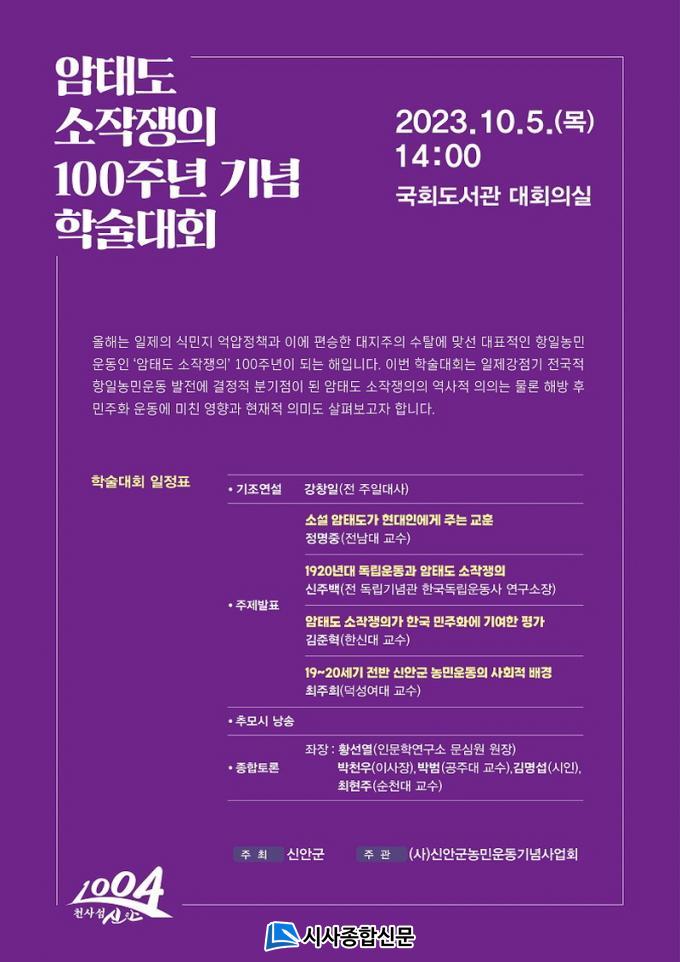 ½Å¾È±º ¹Ú¿ì·® ±º¼ö´Â ¡°1923³â ÀÏÁ¦ ½Ä¹ÎÁö ¼öÅ»°ú Ä£ÀÏ ÁöÁÖ¿¡ ¸Â¼ ½Â¸®¸¦ °ÅµÐ ¾Ïŵµ ¼ÒÀÛÀïÀÇ´Â °áÄÚ Àؾ ¾È µÉ ´ëÇѹα¹ÀÇ ¿ª»çÀÌ¸ç ³ó¹ÎÀÇ ±â·ÏÀÌ´Ù.¡±¶ó¸ç ¡°10¿ù 5ÀÏ, ±¹È¸µµ¼°ü¿¡¼ ¿¸®´Â ¾Ïŵµ ¼ÒÀÛÀïÀÇ 100Áֳ⠱â³ä Çмú´ëȸ¿¡ ¸¹Àº °ü½É°ú Âü¿© ºÎʵ台´Ù.¡±¶ó°í ¸»Çß´Ù.