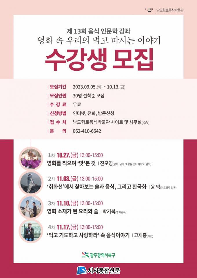 À½½ÄÀι®ÇÐ °Á´ °¢°¢ÀÇ À½½Ä¿¡ ¼·Á ÀÖ´Â °íÀ¯ÀüÅë°ú Ãß¾ïÀ» ¹ÙÅÁÀ¸·Î Àι®ÇÐÀû ÀÇ¹Ì °íÂû°ú Áö¿ª ½Ä(ãÝ)¹®È¿¡ ´ëÇÑ ÁֹεéÀÇ ÀÌÇØ¸¦ µ½°íÀÚ ¸¶·ÃµÈ ÇÁ·Î±×·¥ÀÌ´Ù. ¿ÃÇØ·Î 13¹øÂ°¸¦ ¸ÂÀº À̹ø °Á´ ¡®¿µÈ ¼Ó ¿ì¸®ÀÇ ¸Ô°í ¸¶½Ã´Â À̾߱⡯¸¦ ÁÖÁ¦·Î ³²µµÇâÅäÀ½½Ä¹Ú¹°°ü¿¡¼ ¿î¿µ ±â°£ Áß ¸ÅÁÖ ±Ý¿äÀÏ ¿ÀÈÄ 1½ÃºÎÅÍ 3½Ã±îÁö ȸ´ç 30¿© ¸íÀÇ ÁÖ¹ÎÀ» ´ë»óÀ¸·Î ÃÑ 4ȸ¿¡ °ÉÃÄ ÁøÇàµÈ´Ù.