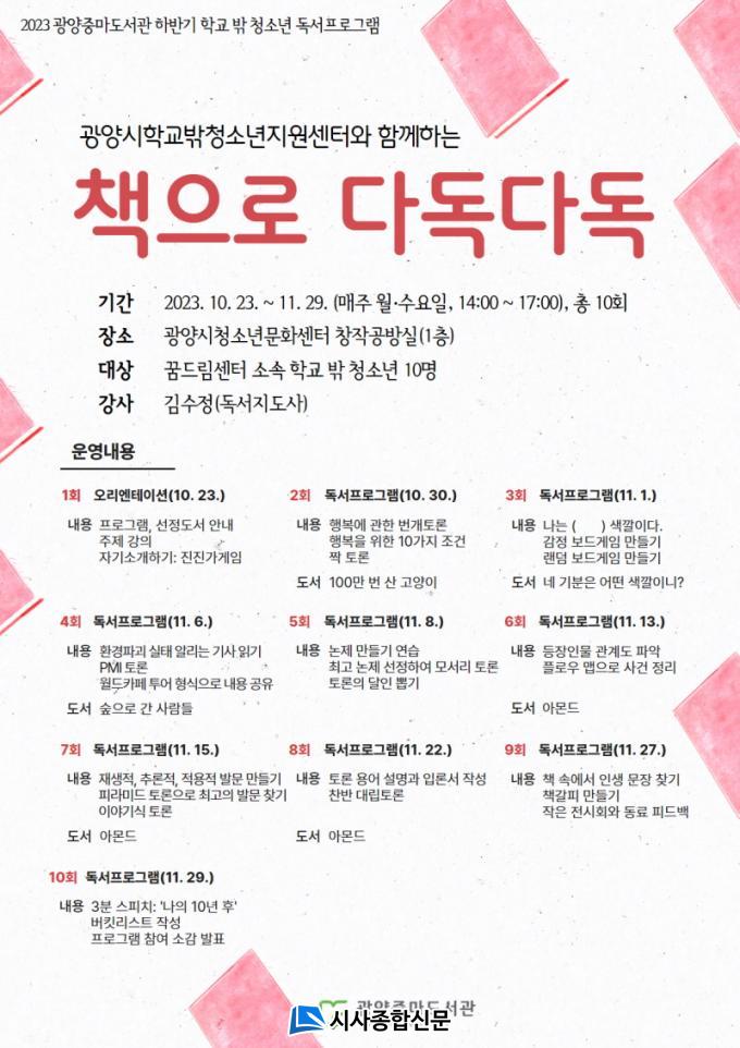 ÇÁ·Î±×·¥Àº 2021³â ±¤¾ç½Ã¸³µµ¼°ü°ú ¾÷¹«Çù¾à(MOU)À» ü°áÇÑ ±¤¾ç½Ã Çб³¹Ûû¼Ò³âÁö¿ø¼¾ÅÍ(²Þµå¸²¼¾ÅÍ)¿Í ¿¬°èÇØ ÁøÇàµÇ¸ç, µ¶¼Áöµµ»ç°¡ °ü°è±â°ü¿¡ Á÷Á¢ ¹æ¹®ÇØ ´Ù¾çÇÑ ÁÖÁ¦ µµ¼ Àбâ¿Í ȸÂ÷º° µ¶¼Åä·Ð, µ¶ÈÄ È°µ¿ µîÀ» ÁøÇàÇÒ ¿¹Á¤ÀÌ´Ù.