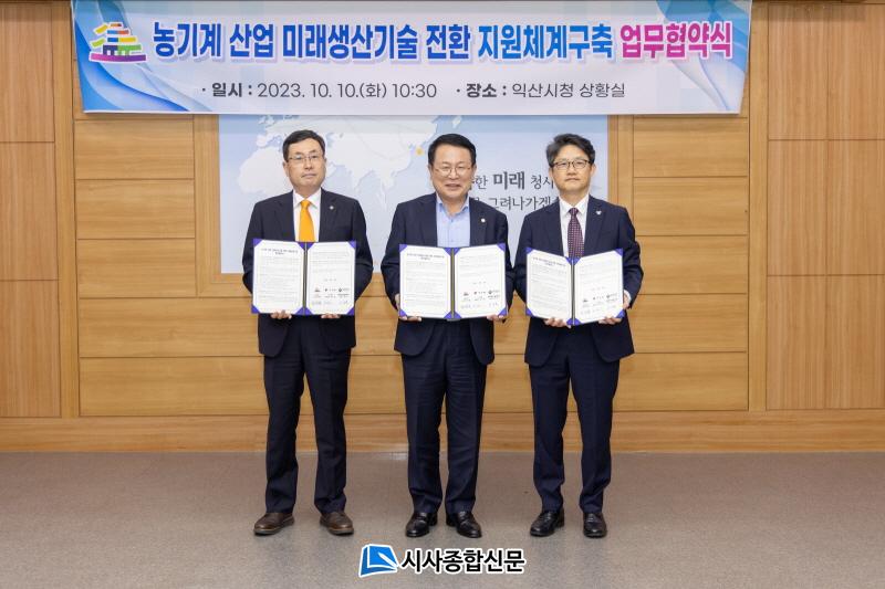 ÀÍ»ê½Ã´Â 10ÀÏ ÀÍ»ê½Ãû »óȲ½Ç¿¡¼ ³ó±â°è¡¤»Ñ¸®»ê¾÷ÀÇ ¼ÒÀ硤ºÎǰ¡¤Àåºñ ºÐ¾ß¸¦ Àü¹®ÀûÀ¸·Î Áö¿øÇÏ´Â ±¹°¡¿¬±¸±â°üÀΡ®Çѱ¹»ý»ê±â¼ú¿¬±¸¿ø¡¯°ú Æ®·¢ÅÍ¡¤ÄÞ¹ÙÀÎ µî ³ó¾÷¿ë±â°èÀÇ ±¹³» ¼±µÎ ±â¾÷À̸ç ÀÍ»ê½Ã¿¡ ¼ÒÀçÇÑ¡®¢ßTYM(µ¿¾ç¹°»ê)¡¯´ëÇ¥µéÀÌ Âü¼®ÇÑ °¡¿îµ¥ ÀÍ»ê½Ã ³ó±â°è »ê¾÷ ¹Ì·¡ »ý»ê±â¼ú Àüȯ Áö¿øÃ¼°è ±¸ÃàÀ» À§ÇÑ ¾÷¹«Çù¾àÀ» ü°áÇß´Ù.