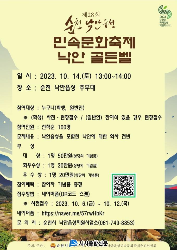 ¡®³«¾È °ñµçº§¡¯Àº Á¶¼±½Ã´ëÀÇ ¹®½Ã¸¦ ÀçÇöÇÑ ¿ª»ç ÄûÁî·Î ´ëÇѹα¹ 3´ë À¾¼º Áß ÇϳªÀÎ ¼øÃµ ³«¾ÈÀ¾¼º¿¡ ´ëÇÑ ¹®Á¦¸¦ ÇÔ²² Ç®¸ç °øºÎÇÏ´Â Çà»çÀÌ´Ù. Âü°¡ÀÚ 100¸íÀ» ¼±Âø¼ø ¸ðÁýÇϸç, ÇлýÀº 12ÀϱîÁö ³×À̹öÆû(https://naver.me/GmfFHO30)À¸·Î Á¢¼öÇϸç, Çà»ç ´çÀÏÀº ÀÜ¿©¼®¿¡ ÇÑÇØ ÀϹÝÀαîÁö ¼±Âø¼øÀ¸·Î Á¢¼öÇÒ ¼ö ÀÖ´Ù.