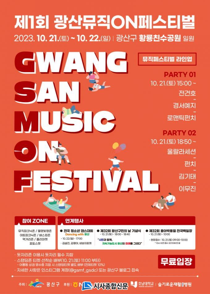 ¿ì¼± ¡®»ýµ¿°¨ ÀÖ´Â µµ½Ã, Áö¼Ó°¡´ÉÇÑ ±¤»ê¡¯À» ´ëÇ¥ÇÒ ÃàÁ¦ Á¦1ȸ ¡®±¤»ê¹ÂÁ÷¿Â(ON)Æä½ºÆ¼¹ú¡¯ÀÌ 21ÀϺÎÅÍ 22ÀϱîÁö ÀÌÆ²°£ Ȳ·æÄ£¼ö°ø¿ø¿¡¼ ¿¸°´Ù. ½Ã¹Î °ø¸ð¸¦ ÅëÇØ ¼±Á¤ÇÑ ¡®Èú¸µ ÇÏÀÌ, Çʸµ ÇÏÀÌ(Healing Hi, Feeling High!)¡¯¸¦ ±¸È£·Î ÀÚ¿¬, »ç¶÷, ÈÞ½Ä ±×¸®°í À½¾ÇÀÌ ÇÔ²²ÇÏ´Â ÃàÁ¦¸¦ ¼±º¸ÀδÙ.