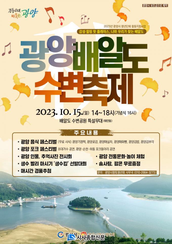 ±¤¾ç ¹è¾Ëµµ ¼öº¯ÃàÁ¦´Â 2023³â ±¤¾ç½Ã û³â´Üü Ȱµ¿ Áö¿ø»ç¾÷ÀÇ ÀÏȯÀ¸·Î ±¤¾ç ¹è¾Ëµµ¸¦ ¸Å·ÂÀûÀÎ °ø°£, ¸¶À½°ú dz°æÀÌ ¸¸³ª´Â ½°ÅÍ, ¿µÈ¥ÀÇ ÈÞ½ÄÀ» ¼±»çÇÏ´Â ´ëÇѹα¹ ¸í¼Ò·Î ¾Ë¸®°í Áö¼ÓÀûÀÎ ¹®È°ü±¤ÄÜÅÙÃ÷ ¹ß±¼À» À§ÇØ ¸¶·ÃµÈ Çà»çÀÌ´Ù.