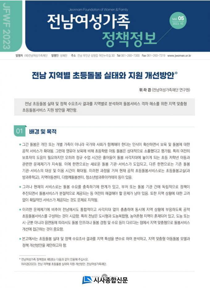 Àü³²¿©¼º°¡Á·Àç´Ü ¼ºÇý¶õ ¿øÀåÀº ¡°Àü³² ¾îµð¿¡ »ìµç ¾Æµ¿µéÀÌ Áú ÁÁÀº µ¹º½¼ºñ½º¸¦ ¹ÞÀ» ¼ö ÀÖµµ·Ï ÇÏ´Â °ÍÀº Àα¸ ¼Ò¸ê À§±â¿¡ ³õÀÎ Àü³²ÀÇ ¹Ì·¡¸¦ À§Çؼµµ Áß¿äÇÏ´Ù¡±°í °Á¶Çϸç, ¡°À̹ø¿¡ ¹ß°£ÇÑ Á¤Ã¥Á¤º¸°¡ Çб³¿Í ¸¶À»ÀÌ ÇÔ²²ÇÏ´Â ÃÎÃÎÇÑ Ãʵº½¸ÁÀ» Á¶¼ºÇϰíÀÚ ÇÏ´Â ºÐµé¿¡°Ô À¯¿ëÇÑ ÂüÁ¶°¡ µÇ±â¸¦ ¹Ù¶õ´Ù ¡±°í ¹àÇû´Ù.