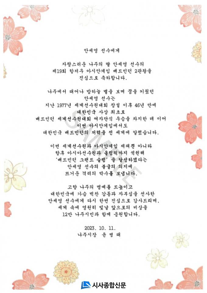 À±º´Å ³ªÁÖ½ÃÀåÀÌ Ç×Àú¿ì ¾Æ½Ã¾È°ÔÀÓ¿¡¼ ¹èµå¹ÎÅÏ 2°ü¿ÕÀ» Â÷ÁöÇÑ ¾È¼¼¿µ ±¹°¡´ëÇ¥¿¡°Ô ÃàÀüÀ» º¸³Â´Ù°í 12ÀÏ ¹àÇû´Ù.