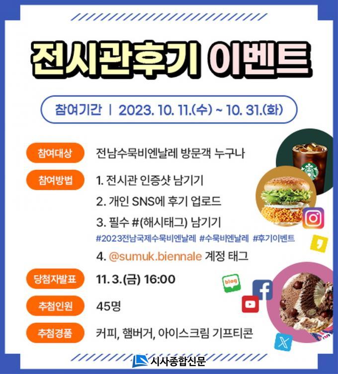 Àü½Ã°ü Èıâ À̺¥Æ®´Â °³ÀÎ ´©¸®¼ÒÅë¸Á¿¡ Àü½Ã°ü °ü¶÷(»çÁø) Èı⸦ ¿Ã¸®°í ´©¸®¼ÒÅë¸Á Çʼö ÇØ½Ãű×(@sumuk.biennale, #2023 Àü³²±¹Á¦¼ö¹¬ºñ¿£³¯·¹, #¼ö¹¬ºñ¿£³¯·¹, #Èıâ À̺¥Æ®)¸¦ ³²±â¸é µÈ´Ù.