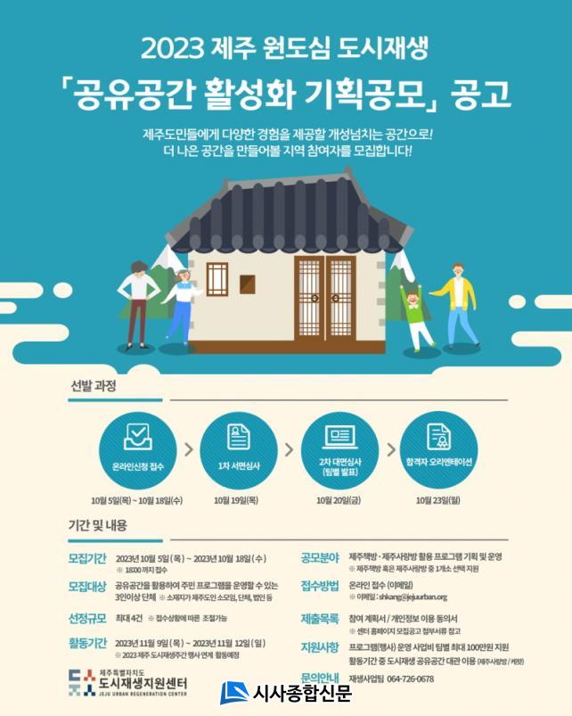 À̹ø °ø¸ð»ç¾÷Àº Á¦Áֽà ¿øµµ½É µµ½ÃÀç»ý °øÀ¯°ø°£À¸·Î Á¶¼ºµÈ¡®Á¦ÁÖÃ¥¹æ¡¤»ç¶û¹æ¡¯ÀÇ ÁÖ¹ÎÂü¿© Ȱ¼ºÈ¸¦ À§ÇØ ¸¶·ÃµÆ´Ù. Á¦ÁÖÃ¥¹æ¡¤»ç¶û¹æ °ø°£À» Ȱ¿ëÇÏ¿© ÁֹεéÀÌ Âü¿©ÇÒ ¼ö ÀÖ´Â ÇÁ·Î±×·¥ ¶Ç´Â °ø¿¬, Àü½Ã µî Çà»ç¸¦ ÅëÇØ »ç¶÷µé°úÀÇ ´Ù¾çÇÑ ¸¸³²À» °®°íÀÚ ÇÏ´Â 3ÀÎ ÀÌ»óÀÇ °øµ¿Ã¼¶ó¸é ´©±¸³ª Áö¿ø °¡´ÉÇÏ´Ù.