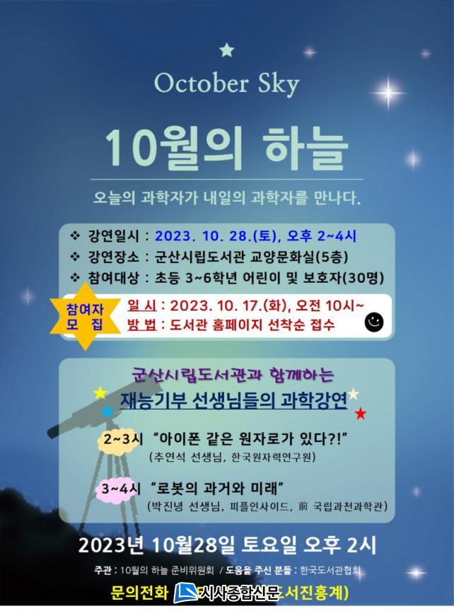 <10¿ùÀÇ ÇÏ´Ã> °úÇа¿¬ Âü¿©Á¢¼ö´Â ¿À´Â 17ÀÏ ¿ÀÀü 10½ÃºÎÅÍ, <¸¶¹ýÀü»ç ¸ÅÁ÷Å·> °¡Á·°ø¿¬ Âü¿©Á¢¼ö´Â 11¿ù 6ÀÏ ¿ÀÀü 10½ÃºÎÅÍ ½Ã¸³µµ¼°ü ȨÆäÀÌÁö(http://lib.gunsan.go.kr) ¿¡¼ ¼±Âø¼øÀ¸·Î ¸ðÁýÇÑ´Ù. ÀÚ¼¼ÇÑ »çÇ×Àº ½Ã¸³µµ¼°ü ȨÆäÀÌÁö¸¦ ÂüÁ¶Çϰųª, ½Ã¸³µµ¼°ü µµ¼ÁøÈï°è(¢Ï454-5630)·Î ¹®ÀÇÇÏ¸é µÈ´Ù.