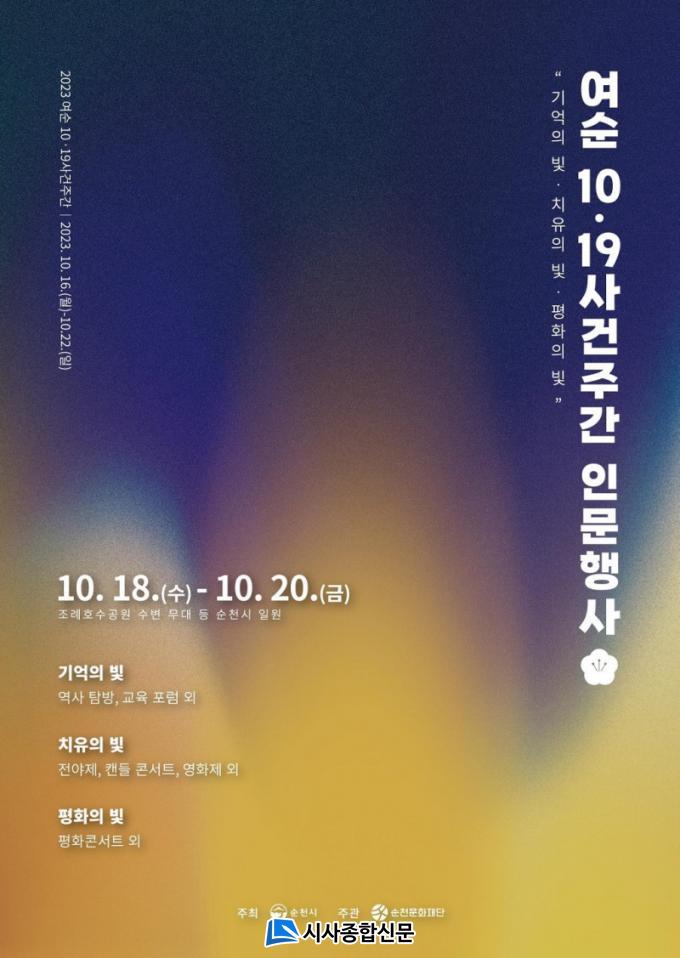 À̹ø Çà»ç´Â ¿©¼ø 10¡¤19 »ç°ÇÀÌ °®´Â ¿ª»çÀû Á߿伺À» Áö¿ª¹ÎÀÌ Á» ´õ ½±°Ô ±â¾ïÇÏ°í °ø°¨ÇÒ ¼ö ÀÖµµ·Ï ´Ù¾çÇÑ ¹®È¿¹¼ú Çà»ç·Î ÁøÇàµÉ ¿¹Á¤ÀÌ´Ù. ¿©¼ø 10¡¤19»ç°ÇÀÇ ¿ª»çÀû ¾ÆÇÄÀ» ¡®ºû¡¯À̶ó´Â ¸Å°³Ã¼¸¦ ÅëÇØ ±â¾ïÇϰí, À¯°¡Á·°ú Áö¿ª¹ÎÀÇ Ä¡À¯¿Í À§·Î, ÆòÈ¿Í ÈÇØ¸¦ À½¾Ç°ú ¹«¿ëÀ¸·Î Ç®¾î³»´Â ÀÚ¸®¸¦ ¸¶·ÃÇß´Ù.