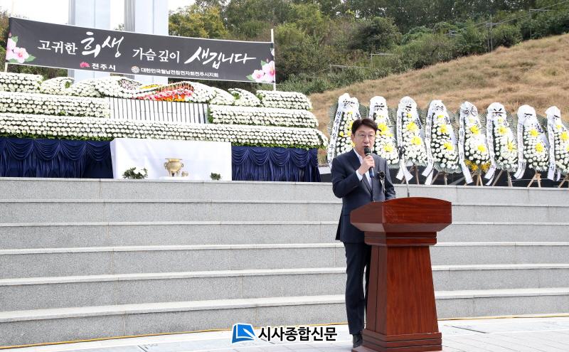 ÇÑÆí, ¿ì¹ü±â ÀüÁÖ½ÃÀåÀº À̳¯ Ã߸ð»ç¿¡¼ ¡°±¹°¡ÀÇ ºÎ¸§À» ¹Þ°í À̾︸¸® ŸÁö¿¡¼ ÂüÀüÇØ ÀþÀº ûÃá¿¡ Àü»çÇÑ ¿ì¸® Áö¿ª ¿µ·ÉµéÀÇ Çå½ÅÀ» µÇ»õ±â¸ç, ¿µ¿øÇÑ ¾È½ÄÀ» ±â¿øÇÑ´Ù¡±°í ¸»Çß´Ù.