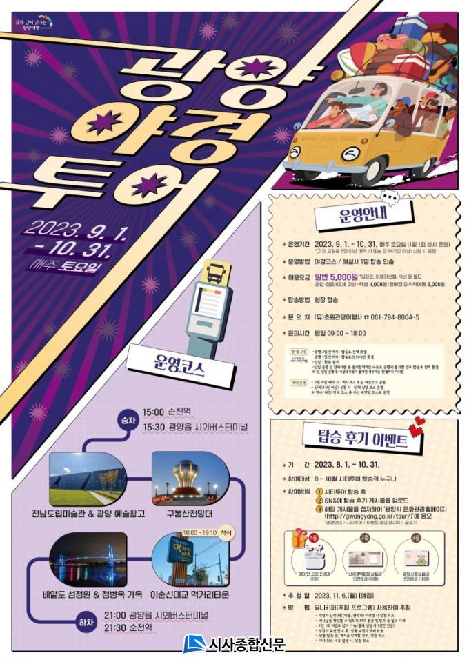 ¡®10¿ù ±¤¾ç½ÃƼÅõ¾î¡¯´Â Åä¿äÀÏ ¿ÀÈÄ 3½Ã ¼øÃµ¿ª¿¡¼ ¿¹¾à ¾øÀÌ ¹Ù·Î ž½ÂÇÒ ¼ö ÀÖÀ¸¸ç ÆòÀÏ ¹× ÀÏ¿äÀÏ¿¡´Â 5¸í ÀÌ»ó ¿¹¾à ½Ã¿¡¸¸ ¿î¿µÇÑ´Ù. ÀÌ¿ë¿ä±ÝÀº ÀÏ¹Ý 5õ¿ø, ±ºÀÎ․°æ·Î․Çлý 4õ¿ø, Àå¾ÖÀÎ․¹ÌÃëÇоƵ¿ 3õ¿øÀ̸ç ÀÔÀå·á, ¿©ÇàÀÚº¸Çè, ½Äºñ µîÀº º°µµ´Ù. ±âŸ ÀÚ¼¼ÇÑ »çÇ×Àº ±¤¾ç½Ã ¹®È°ü±¤ ȨÆäÀÌÁö ¡®°ü±¤¾È³»¡¯ÀÇ ¡®½ÃƼÅõ¾î¡¯ Äڳʸ¦ Âü°íÇÏ¸é µÈ´Ù.