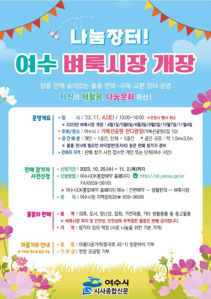 | ¿©¼ö½Ã, 2023³â ¸¶Áö¸· ³ª´®ÀåÅÍ! 11¿ù 4ÀÏ ¡®°³À塯 °ÅºÏ¼±°ø¿ø Àܵð±¤Àå ¿ÀÈÄ 1~4½Ã¡¦11¿ù 2ÀϱîÁö ¿Â¶óÀÎ Âü°¡ ½Åû |