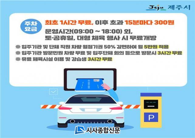 ³»ÀÏ 11¿ù 1ÀϺÎÅÍ ½ÃÇàµÇ´Â Á¦ÁÖÁ¾ÇÕ°æ±âÀå ÁÖÂ÷Àå À¯·á ¿î¿µ½Ã°£Àº ÆòÀÏ ¿ÀÀü 9½ÃºÎÅÍ ¿ÀÈÄ 6½Ã±îÁö ¿î¿µµÇ¸ç ÀÌ¿¡ µû¸¥ ¿ä±ÝÀº Â÷µî ºÎ°úµÈ´Ù. ÃÖÃÊ 1½Ã°£ ÁÖÂ÷¿¡ ´ëÇØ¼´Â ¹«·áÀ̰í, ÀÌÈÄ 15ºÐ Ãʰú½Ã¸¶´Ù 300¿ø¾¿ ¿ä±ÝÀÌ Ãß°¡·Î ºÎ°úµÇ¸ç, 1ÀÏ ÃÖ´ë ºÎ°úµÇ´Â ¿ä±ÝÀº 9,600¿øÀÌ´Ù. ¿î¿µ ¿Ü ½Ã°£°ú Åä¿äÀϰú °øÈÞÀÏ, °ø°ø¸ñÀûÀÇ ´ëÇü Çà»ç ½Ã¿¡´Â ¹«·á·Î °³¹æµÈ´Ù.´çÃÊ¿¡´Â ÃÖÃÊ 30ºÐ ÁÖÂ÷¿¡ ÇÑÇØ ¹«·á·Î ¿î¿µÇÒ ¿¹Á¤À̾úÀ¸³ª, ½Ã¹ü¿î¿µ ±â°£ µ¿¾È Àα٠Áö¿ªÁֹΰú üÀ°½Ã¼³ ÀÌ¿ëÀÚ, Á¾ÇÕ°æ±âÀå³» ÀÔÁÖ±â°ü°ú ´ÜüµéÀÇ ÀǰßÀ» ¹Ý¿µÇØ ÃÖÃÊ 1½Ã°£À» ¹«·á·Î Àû¿ëÇß´Ù.