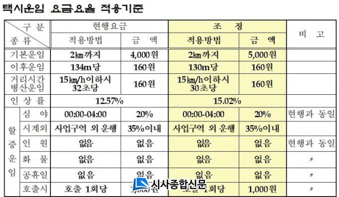 Àλó ¿ä±Ý ü°è¿¡ µû¸£¸é ÁßÇü Åýà ±âÁØ ±âº»¿ä±Ý(2km)Àº 5,000¿øÀ¸·Î Á¶Á¤µÇ¸ç °Å¸®¿ä±ÝÀº ±âÁ¸ 134m´ç 160¿ø¿¡¼ 130m´ç 160¿øÀ¸·Î,½Ã°£¿ä±ÝÀº(15km/hÀÌÇÏ ÁÖÇà ½Ã) 32ÃÊ´ç 160¿ø¿¡¼ 30ÃÊ´ç 160¿øÀ¸·Î Á¶Á¤µÈ´Ù. ÇÒÁõ ¿ä±ÝÀº ±âÁ¸°ú µ¿ÀÏÇÏ°Ô À¯ÁöµÅ, ½Ã°è ¿Ü(»ç¾÷ ±¸¿ª ¿Ü ¿îÇà ½Ã) ÇÒÁõÀº 35%, ½É¾ß(¿ÀÀü 0½ÃºÎÅÍ 4½Ã±îÁö) ÇÒÁõÀº 20%°¡ Àû¿ëµÇ°í ½É¾ß ÇÒÁõ°ú ½Ã°è ¿Ü ÇÒÁõÀÌ Áߺ¹ Àû¿ëµÇ´Â °æ¿ì 40%¸¦ ³ÑÁö ¸øÇÑ´Ù.