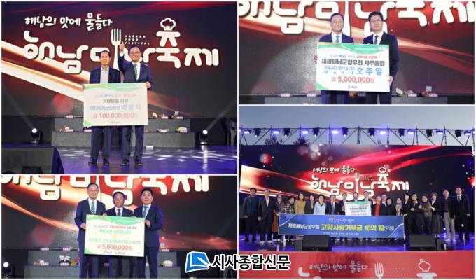 Àç±¤ÇØ³²±ºÇâ¿ìȸ(ȸÀå ±è¼ö°ü)¿¡¼´Â Àüü ȸ¿øµéÀÇ ¶æÀ» ¸ð¾Æ ¿¬Â÷ÀûÀ¸·Î ÃÑ 10¾ï¿øÀÇ °íÇâ»ç¶û±âºÎ±ÝÀ» ±âºÎÇϱâ·Î ¾àÁ¤Çß´Ù. ÇØ³²¹Ì³²ÃàÁ¦ Âü¿©¸¦ À§ÇØ °íÇâÀ» ¹æ¹®ÇÑ Çâ¿ìȸ¿ø 30¿©¸íÀÌ ¾àÁ¤½Ä¿¡ Âü¿©ÇÑ °¡¿îµ¥, Àü ȸ¿øµéÀÌ °íÇâ»ç¶û±âºÎÁ¦ Âü¿©¸¦ ÅëÇØ ÇØ³²¹ßÀü¿¡ Çâ¿ìµéÀÇ ÈûÀ» º¸Å³ª°¡±â·Î ÀÇÁö¸¦ ¸ð¾Ò´Ù.