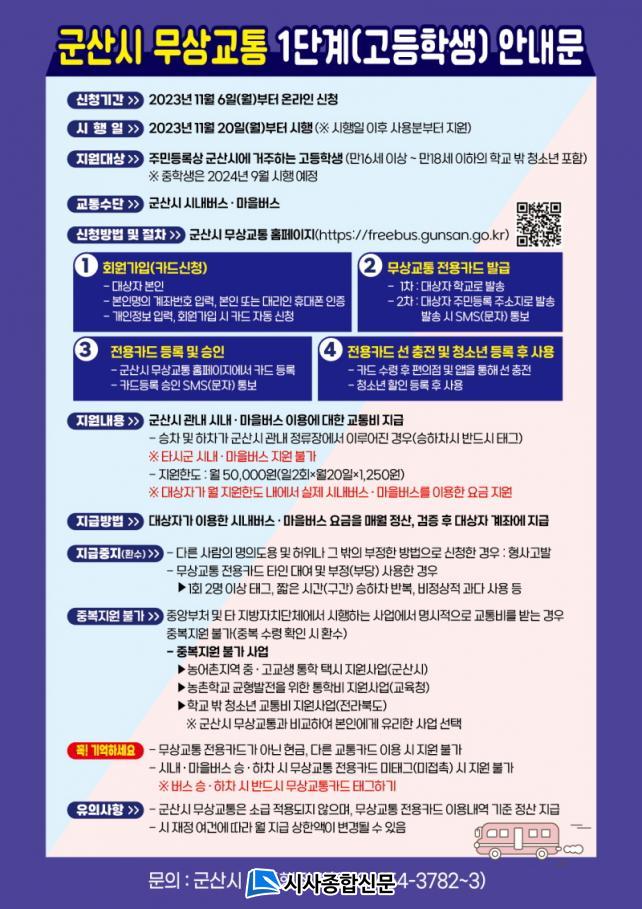 ½Ã¿¡ µû¸£¸é ¹Î¼± 8±â °ÀÓÁØ ±º»ê½ÃÀåÀÇ °ø¾à»ç¾÷ÀÎ Áß¡¤°íµîÇлý ½Ã³»¹ö½º ¹«»ó±³Åë »ç¾÷Àº Áö¿ª ³» À̵¿ Áõ°¡¿Í ±³Åëºñ Àý°¨À¸·Î Áö¿ª°æÁ¦¿Í ´ëÁß±³Åë ÀÌ¿ë Ȱ¼ºÈ¸¦ µµ¸ðÇϰí, »çȸ°æÁ¦Àû ¾àÀÚÀÎ Áß¡¤°íµîÇлýÀÇ ÀÚÀ¯·Î¿î À̵¿±ÇÀ» º¸ÀåÇϱâ À§ÇØ ÃßÁøµÆ´Ù. 1´Ü°è´Â °íµîÇлý, 2´Ü°è´Â ÁßÇлýÀ» ´ë»óÀ¸·Î ´Ü°èÀû ½ÃÇàÇÒ ¿¹Á¤À̸ç À̹ø ¹«»ó±³ÅëÀº 1´Ü°è·Î °íµîÇлýÀ» ´ë»óÀ¸·Î ¿ì¼± ½ÃÇàÇÑ´Ù.