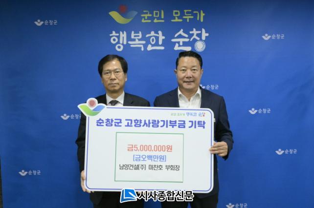 [½Ã»çÁ¾ÇսŹ® = ±è¿¬Èñ ±âÀÚ] ¼øÃ¢±ºÀº 8ÀÏ Àü³² ³ªÁֽÿ¡ ¼ÒÀçÇϰí ÀÖ´Â ³²¾ç°Ç¼³(ÁÖ) ¸¶ÂùÈ£ ºÎȸÀåÀÌ °íÇâ»ç¶û±âºÎ±Ý °³ÀÎ ÃÖ°í¾×ÀÎ 500¸¸¿øÀ» ±âŹÇß´Ù°í ¹àÇû´Ù.