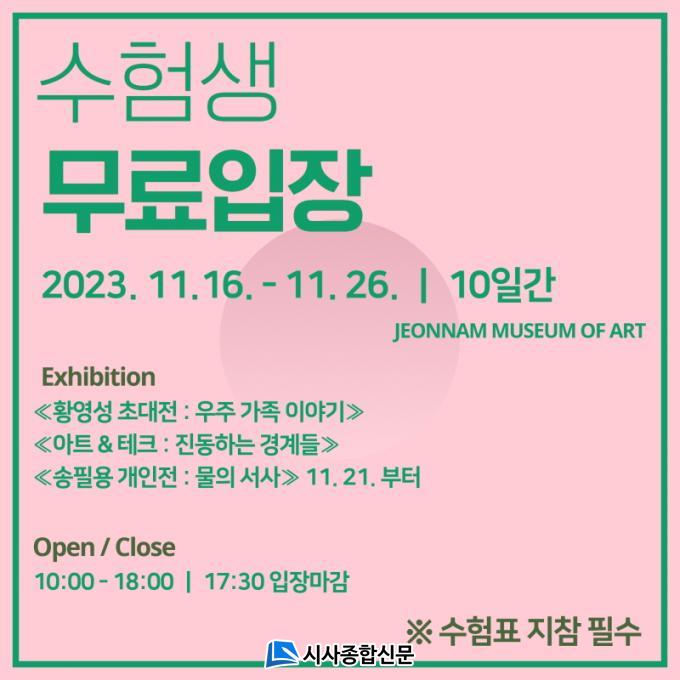 À̹ø À̺¥Æ®´Â ¿À´Â 26ÀϱîÁö 10Àϰ£ ÁøÇàµÇ¸ç, º»ÀÎ ¸íÀÇÀÇ ¼öÇèÇ¥¸¦ ÁöÂüÇϸé Àü½Ã ¹«·áÀÔÀå ÇýÅÃÀ» ¹ÞÀ» ¼ö ÀÖ´Ù. ÇöÀç µµ¸³¹Ì¼ú°ü¿¡¼´Â ¡®È²¿µ¼º ÃÊ´ëÀü : ¿ìÁÖ °¡Á· À̾߱⡯¿Í ¡®¾ÆÆ®&Å×Å© : Áøµ¿ÇÏ´Â °æ°èµé¡¯ÀÌ ÁøÇàµÇ°í ÀÖ´Ù. ¿À´Â 21ÀÏ¿¡´Â »õ·Î¿î Àü½Ã ¡®¼ÛÇÊ¿ë °³ÀÎÀü : ¹°ÀÇ ¼»ç¡¯°¡ ½ÃÀ۵Šº¸´Ù dz¼ºÇÑ Àü½Ã¸¦ Áñ±æ ¼ö ÀÖ´Ù.