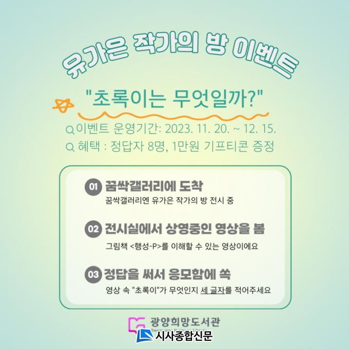¿À´Â 12¿ù 2ÀÏ¿¡ ¿¸®´Â ¡¸À¯°¡Àº ÀÛ°¡¿Í ¸¸³²¡¹¿¡¼´Â ÀÛ°¡°¡ Á÷Á¢ ÀоîÁÖ´Â ±×¸²Ã¥, ±×¸²Ã¥ ÄûÁî, ¡®ÀÛ°¡ÀÇ ¹æ¡¯ Àü½Ã ¼³¸í, üÇèȰµ¿ µîÀ» ÁøÇàÇÒ ¿¹Á¤ÀÌ´Ù. üÇèȰµ¿Àº ƯÈ÷ ¾î¸°À̵鿡°Ô ÀαⰡ ³ôÀº ±×¸²Ã¥ ¼Ó ij¸¯Å͸¦ ÀÌ¿ëÇÑ ·¹Áø¾ÆÆ® ±ÂÁî ¸¸µé±âÀÌ´Ù. µµ¼°üÀº ÀÛ°¡¿Í ¸¸³² ¿Ü¿¡µµ Àü½ÃÀåÀ» ã´Â °ü¶÷°´µéÀ» ´ë»óÀ¸·Î ÀÌ´Þ 20ÀϺÎÅÍ ³»´Þ 15ÀϱîÁö Âü¿© À̺¥Æ®¸¦ ¿î¿µÇÑ´Ù. Àü½ÃÀå¿¡ »ó¿µ ÁßÀÎ <Ç༺-P> ¿µ»óÀ» º¸°í ÄûÁî¿¡ ÀÀ¸ðÇϸé ÀÀ¸ð ´ë»óÀÚ Áß 8¸íÀ» ÃßÃ·ÇØ ±âÇÁƼÄÜÀ» ÁõÁ¤ÇÒ °èȹÀÌ´Ù.