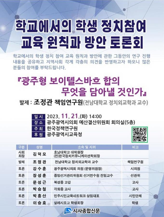 17ÀÏ ½Ã±³À°Ã»¿¡ µû¸£¸é À̳¯ Åä·Ðȸ´Â Áö³ 8¿ù 30ÀÏ 1Â÷ Åä·Ðȸ¿¡ ÀÌÀº µÎ ¹øÂ°·Î µ¶ÀÏ Áøº¸¿Í º¸¼ö Á¤Ä¡±³À°ÇÐÀÚµéÀÌ ¸ð¿© Á¤ÇÑ Á¤Ä¡ ±³À° ÁöħÀÎ ¡®º¸ÀÌÅÚ½º¹ÙÈå ÇÕÀÇ¡¯¿Í °°Àº ¡®Çлý Á¤Ä¡ Âü¿© ±³À° Á¤Ã¥ ¹æ¾È¡¯À» °³¹ßÇϰíÀÚ ¸¶·ÃµÆ´Ù. ¡®±¤ÁÖÇü º¸ÀÌÅÚ½º¹ÙÈå ÇÕÀÇ, ¹«¾ùÀ» ´ã¾Æ³¾ °ÍÀΰ¡¡¯¸¦ ÁÖÁ¦·Î Çлý, ±³¿ø, ½Ã¹Î, À¯°ü±â°ü ´ëÇ¥°¡ Âü¿©ÇØ ±×°£ ¿¬±¸µÈ ¿øÄ¢°ú ¹æ¾ÈÀ» °øÀ¯Çϰí ÀÌ¿¡ ´ëÇÑ ÀǰßÀ» ¼ö·ÅÇÒ ¿¹Á¤ÀÌ´Ù.