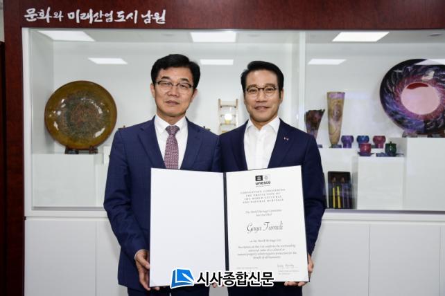 [½Ã»çÁ¾ÇսŹ® = ±è¿¬Èñ ±âÀÚ] ³²¿ø½Ã´Â 27ÀÏ ¹®ÈÀçû ÁÖÃÖ·Î ¿¸° ¡®°¡¾ß°íºÐ±º ¼¼°èÀ¯»ê µîÀç ÀÎÁõ¼ Àü´Þ½Ä¡¯¿¡¼ À¯³×½ºÄÚ ÃøÀ¸·ÎºÎÅÍ ³²¿ø À¯°î¸®¿Í µÎ¶ô¸® °íºÐ±º ¼¼°èÀ¯»ê µîÀç ÀÎÁõ¼¸¦ ¹Þ¾Ò´Ù.