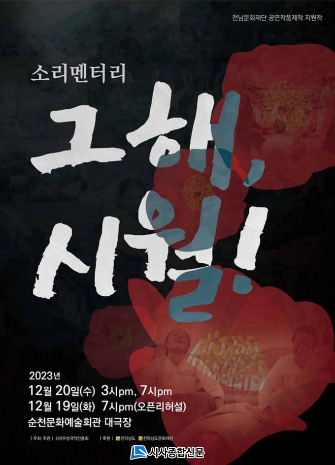 °ø¿¬Àº Àü³²¹®ÈÀç´Ü ÈÄ¿øÀ¸·Î ¿À´Â 12¿ù 19ÀÏ ¿ÀÈÄ 7½Ã(¿ÀǸ®Çã¼³)¿Í 20ÀÏ ¿ÀÈÄ 3½Ã¿Í 7½Ã, ¼øÃµ ¹®È¿¹¼úȸ°ü ´ë±ØÀå¿¡¼ ¿¸°´Ù. °ü¶÷·á´Â ¹«·áÀÌ¸ç °ø¿¬ °ü¶÷±Ç ¼ÒÁöÀÚ³ª »çÀü ¿Â¶óÀÎ ¿¹¾àÀÚ¿¡ ÇÑÇØ ÀÔÀåÇÒ ¼ö ÀÖ´Ù.(°ø¿¬¹®ÀÇ 010-2333-1669)